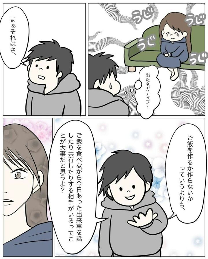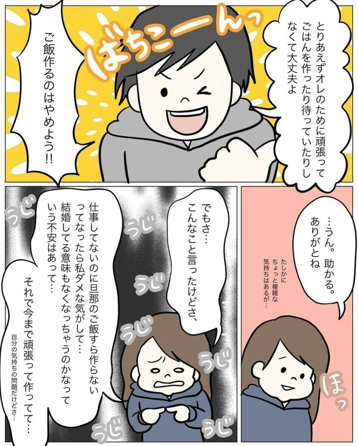 料理や食事に関しての価値観やとらえ方も人それぞれです。夫は、手作りの料理にこだわってはいない様子。たまままさんも自分を振り返り、料理をしなければいけないと自分を追い込んでいたかもと考えます。2人で思いを話し合うことができたのはプラスだったように読み取れます。