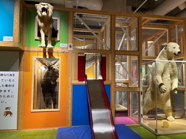 コンパスのすごいところはその展示方法。大人も子どもも中に入ってビックリすること間違いなしです。 剥製の展示のすぐ横にアスレチックがあり、剥製を間近で見ながら遊ぶことができる施設なのです。遊んでいるうちに、思いがけない動物(剥製)との出会いがあったり、その迫力におどろかされたり、とにかくワクワクがとまりません!