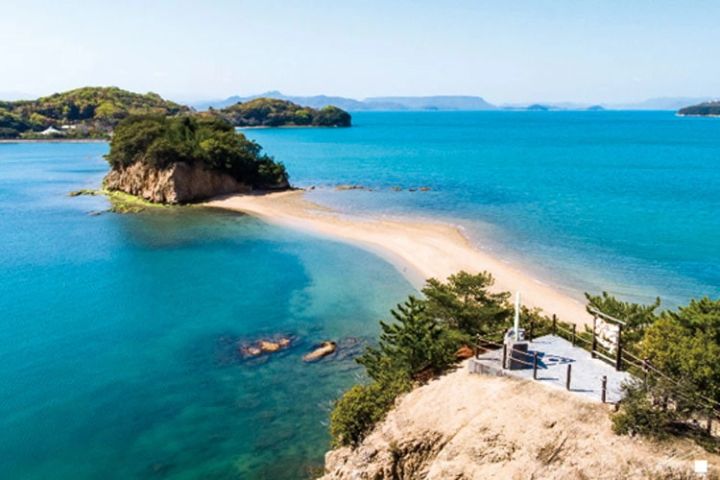 干潮時に海の中から現れる美しい砂の道。大切な人と手をつないで渡ると願いが叶うらしい♡ 渡る手前にある「約束の丘展望台」には幸せの鐘もあるのでそちらも要チェック。