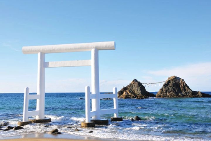 真っ白な鳥居とコバルトブルーの海が幻想的な絶景スポット。その景色は、日本の渚100選や日本の夕日100選にも選ばれ、「夕日の二見ヶ浦」とも呼ばれている。