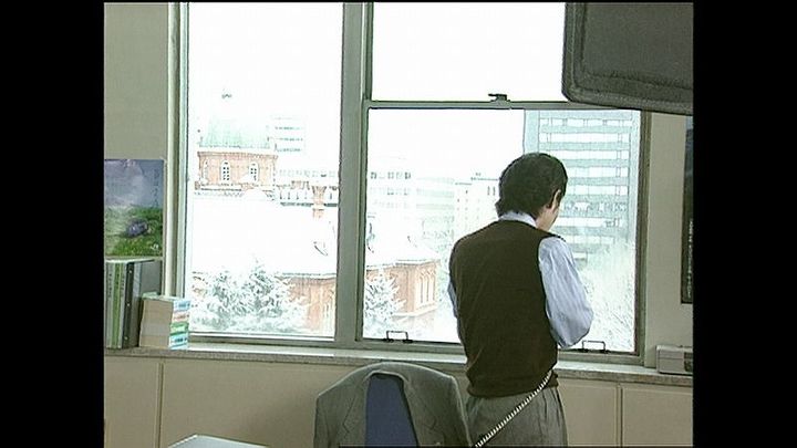 HBCの旧社屋で撮影された映画のワンシーン。窓の外には道庁赤れんが庁舎が