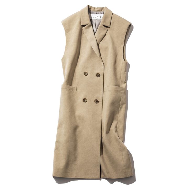 ジャケット感覚でキレイめに着られて断然今っぽく見違えるロングジレ。テーラードのダブルボタンなら着回し力抜群。¥35,200(ルーニィ)