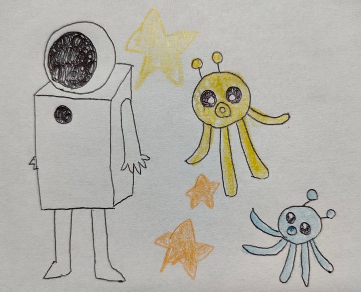そんな状況で、娘はいつもいる部屋から隣の部屋に行くときに毎回大泣きしていたとのことです。先生も何が嫌なのか最初は気づかなかったようですが、途中でヘルメットを被った想定で顔が真っ黒な宇宙飛行士の作品を指さしていることに気づき、「あ、これか」となったそうです(私の拙い手書きで恐縮ですが、イラストの左にいるやつです)。