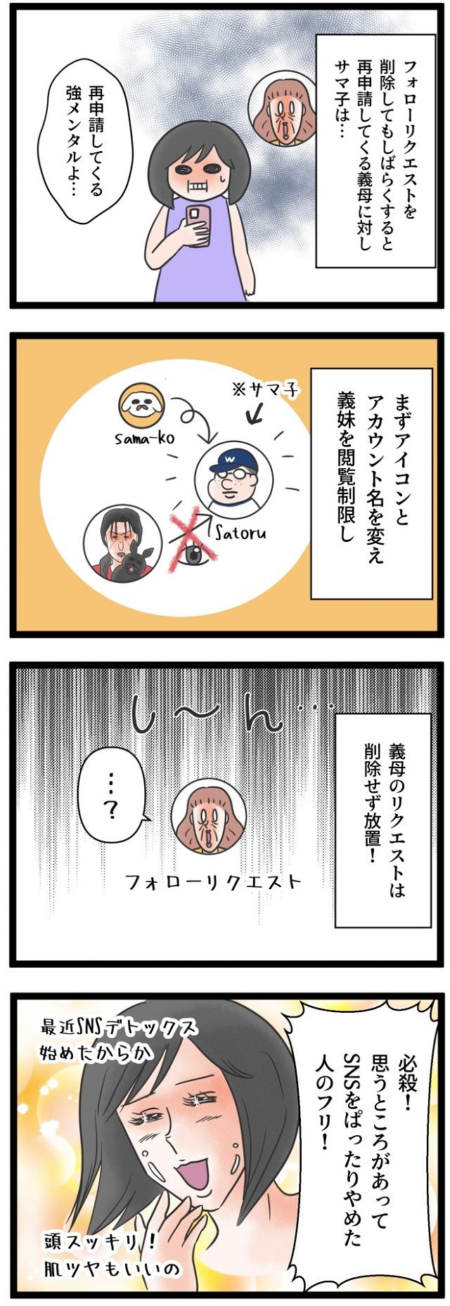 過去の教訓を活かしてお義母さんからの友達申請を「ガン無視」することにしたサマ子さん、その後、特に連絡もなく安心していたところ・・まさかの再申請が・・!なかなか諦めないお義母さんに言葉を失うのでした・・。