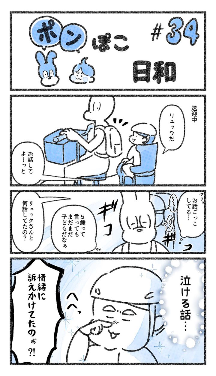 たまたまいつもと違うリュックを背負って自転車でお迎えに行くと、「リュックさんだ。お話してよ~っと」と。5歳といってもまだまだ子どもだな~と思い、しばらくしてから「何話してたの?」と聞くと、「泣ける話…」と(笑)。
