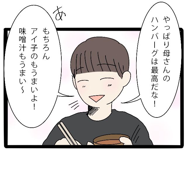 「やっぱり母さんのハンバーグは最高だな!あ、もちろんアイ子のもうまいよ!味噌汁もうまい~」