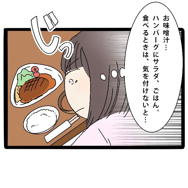 (お味噌汁・・ハンバーグにサラダ、ごはん。食べる時は気をつけないと・・)