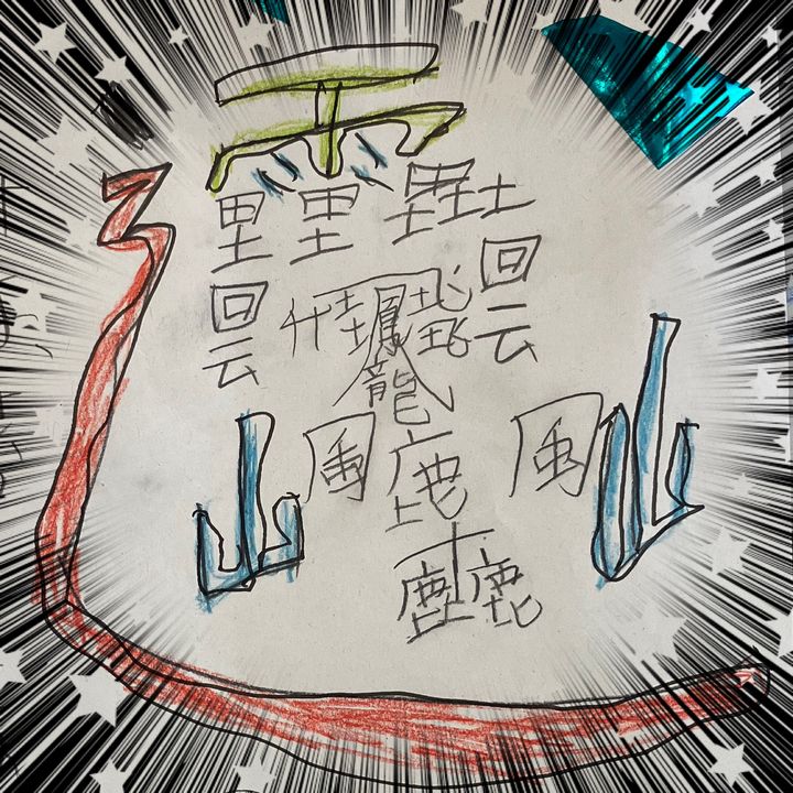 後々息子に教えてもらったのですが、この作品はふざけた訳ではなく、実在する漢字なのだとか。世界で画数の最も多い漢字で、読み方は”huang“もしくは“chao“という事で意見が分かれ物議をかもしているそう。