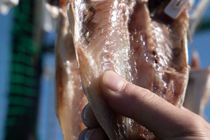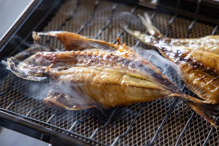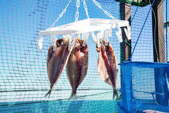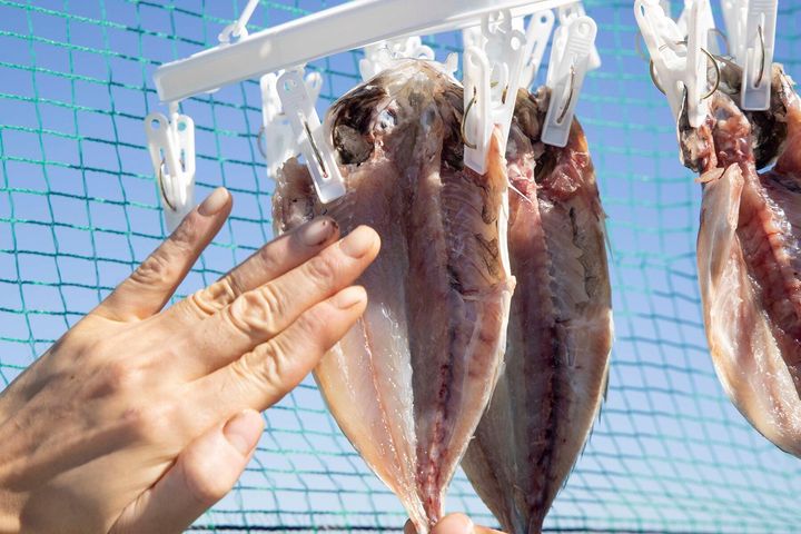 「天気の条件次第ですが、だいたい3~4時間干せば完成です。日光の紫外線によって魚のたんぱく質が分解して旨味成分となり、ガツンとしたコクが出ます。皮目はパリッと身はふっくらと仕上がりますよ。特に青魚は天日干しが一番です。ただし、ブリは直射日光を当てると黒ずみやすいので注意してください」