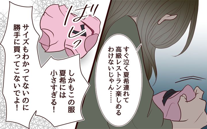 何もわかっていない聡に腹が立った明日香。赤ちゃん連れでホテルのレストランが楽しめるはずないし、おしゃれして出かけるよりも、今の私は家でのんびりと家族団らんのひと時を過ごしたい!もう私と娘に関わらないで…。