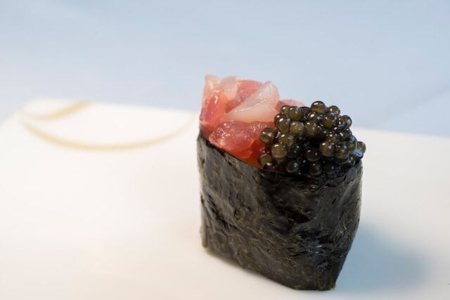 ここで紹介するのは、ランチやディナーのアラカルトとして注文できる「お遊びキャビアセット」。その内容は、6gのキャビアとアオリイカのタルタル、軍艦のシャリと海苔が2つ。ソースは天然醸造の醤油とオリーブオイル、バジルソースの3種類に、ワサビがセットになっています。