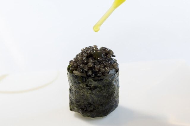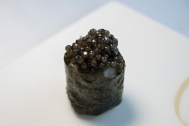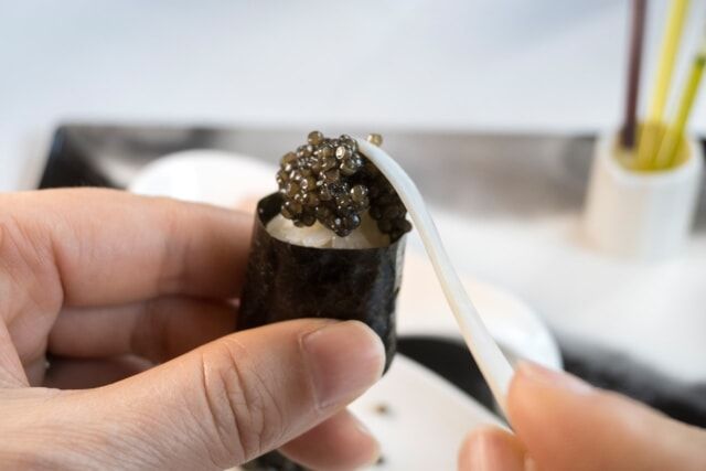 ご飯に三陸産の海苔を巻いて、セルフでキャビアをトッピング。これだけでも、かなりの量のキャビアです。