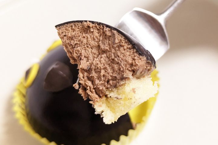 後ろのほうから食べました。ケーキの土台部分はフワフワのスポンジケーキで、ドーム部分はチョコクリームです。少し食べ進めると、スイーツの中央部分にはクランチ状のチョコビスケットが入っていて、よいアクセントになっています。