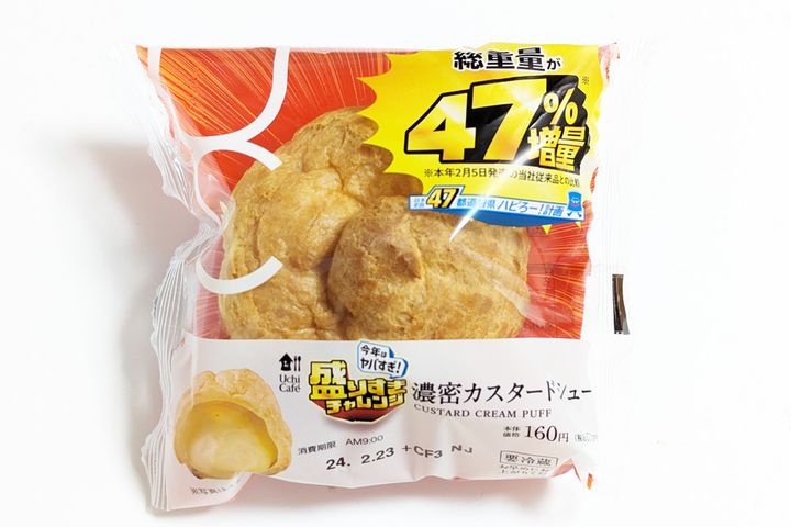 2024年2月5日にスタートしたローソンの「盛りすぎチャレンジ」。人気商品が価格はそのままで47%増量という、お得すぎる企画です。スイーツ部門で第3弾として発売されたのは「濃密カスタードシュー」。通常バージョンよりひと回りもふた回りも大きく、ずっしりとしています。