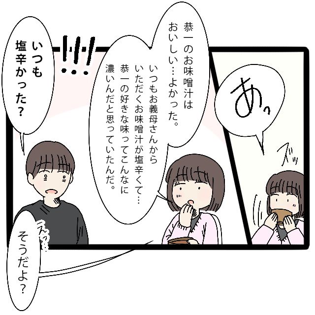 「あっ、恭一のお味噌汁はおいしい・・よかった。いつもお義母さんからいただくお味噌汁が塩辛くて・・恭一の好きな味ってこんなに濃いんだと思ってたんだ」