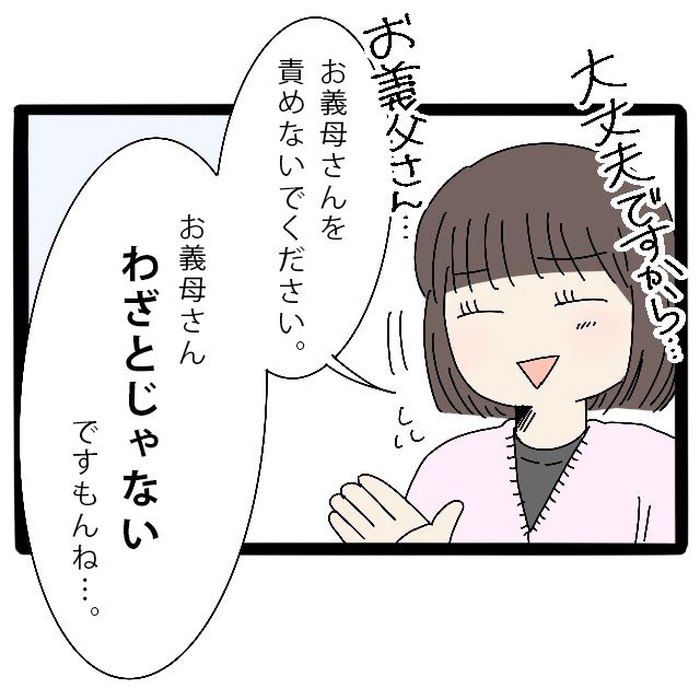 「大丈夫ですから・・。お義父さん、お義母さんを責めないでください。お義母さん、わざとじゃないですもんね・・」