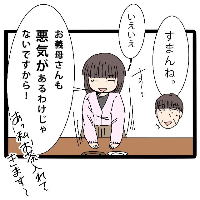 「いえいえ。お義母さんも悪気があるわけじゃないですから!あ、私お茶淹れてきます~」