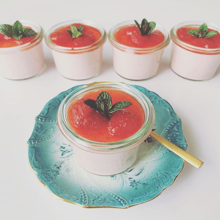 ③小さな耐熱容器に水、ゼラチンを入れてふやかし、様子を見ながらレンジ(600W)で20秒ほど温めて溶かしたものを②に入れて混ぜ、容器に分け入れて、冷蔵庫で1時間ほど冷やす。お好みでいちごジャムをかけ、ミントをのせる。