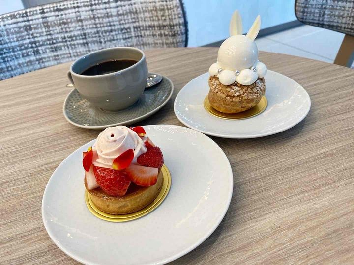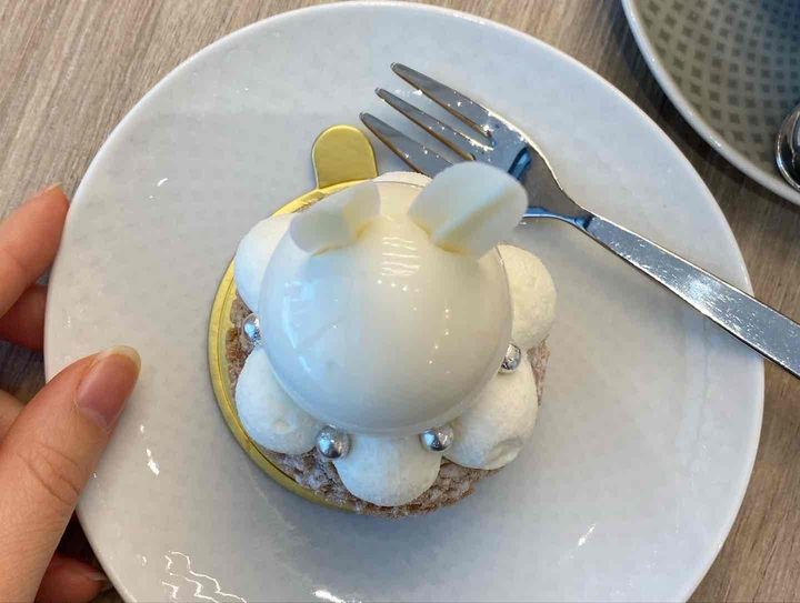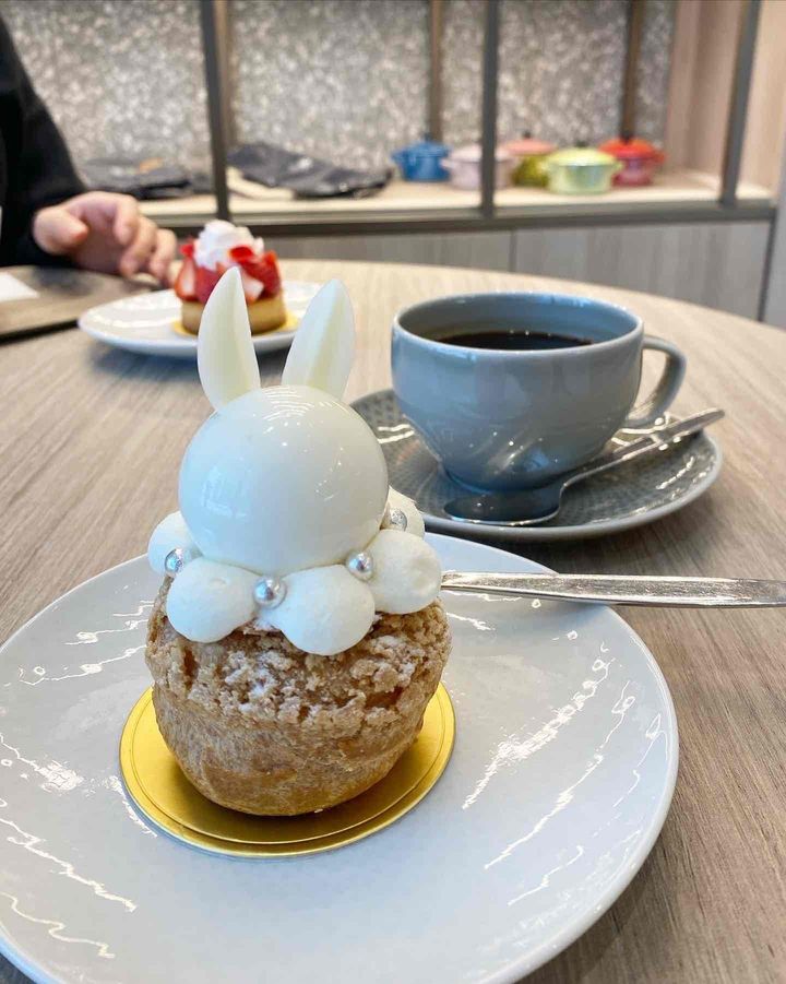 どのスイーツもとても魅力的でしたが、この日私が選んだのは「シュー・ラビット」。シュークリームの上にうさぎモチーフのムースがトッピングされていて、ピョーンと立ったチョコレートの耳と襟飾りのようなクリームがキュート!