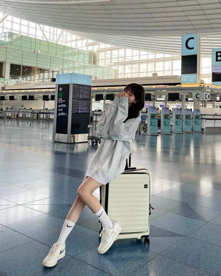 空港コーデということで、飛行機の中でも楽な服装にしたことや、可愛く見えるポージングを意識しました。