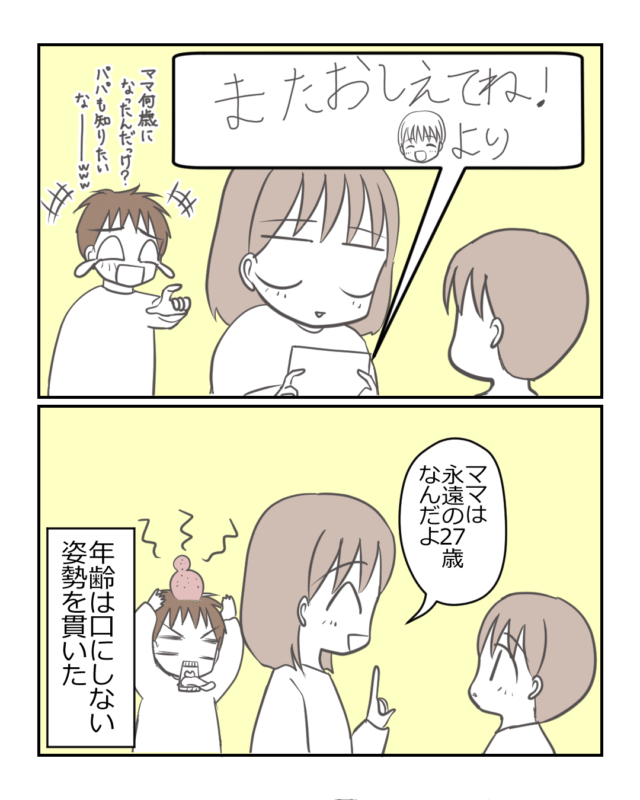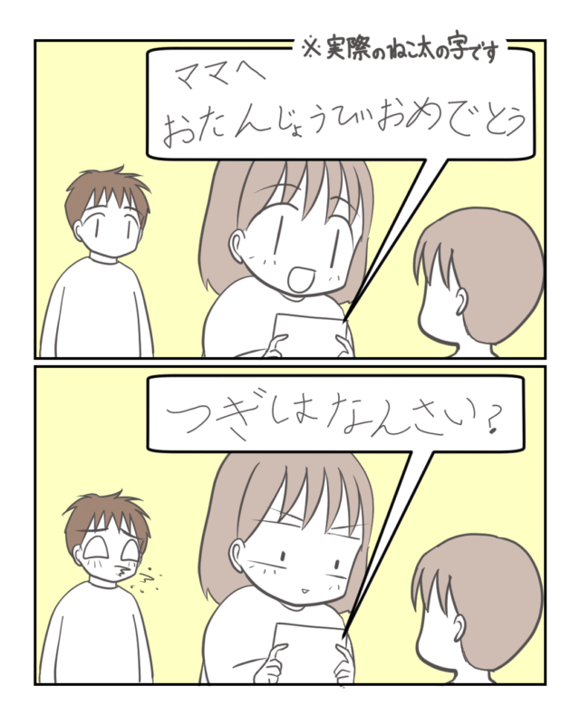 あはは!本当、子どもが突然ママの年齢を聞く時、ありますよねー!「永遠の27歳」、いいですねー!そして・・ねこ太くんの達筆・・すごーい!