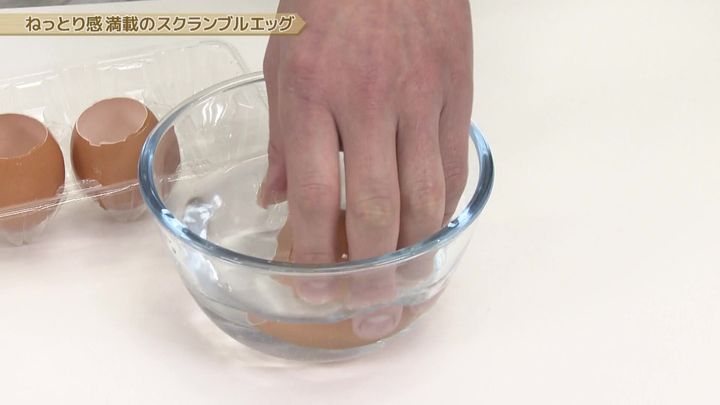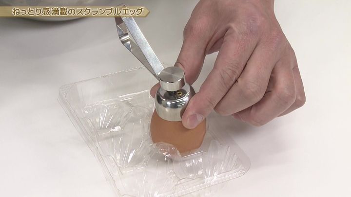 ④スクランブルエッグを作っていく。まずは卵を割りましょう。エッグシェルカッターがあればキレイに蓋のように殻が取れます!