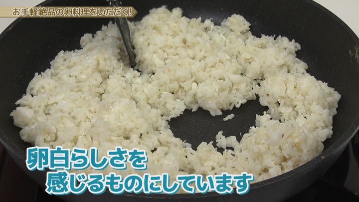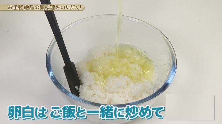 ②いよいよチャーハン作りです。ボウルに卵白を入れて軽く溶きほぐしてそこにご飯を加えよく混ぜる。