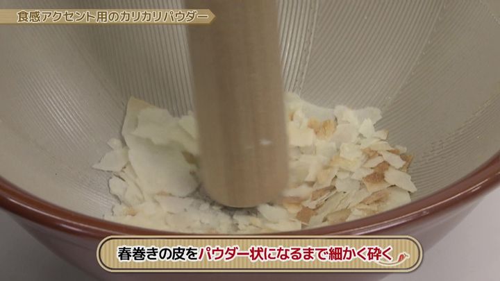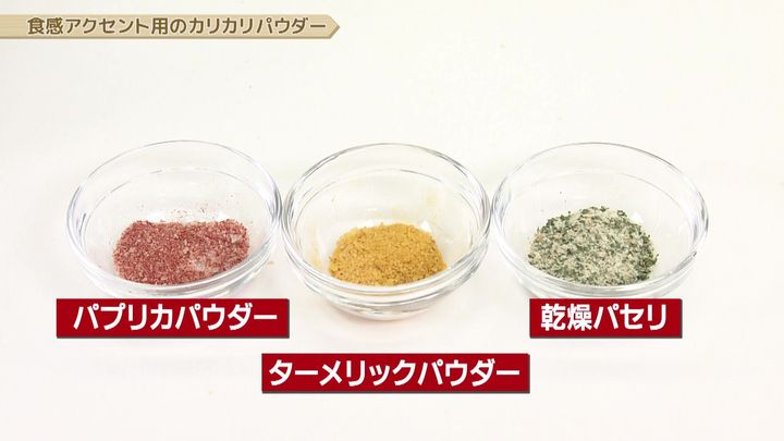 ③3等分にし、パプリカパウダー、ターメリックパウダーと混ぜる。乾燥パセリはすり鉢の中でパラパラになった春巻きの粉と混ぜて一度すると滑らかになる。これで3色完成!!