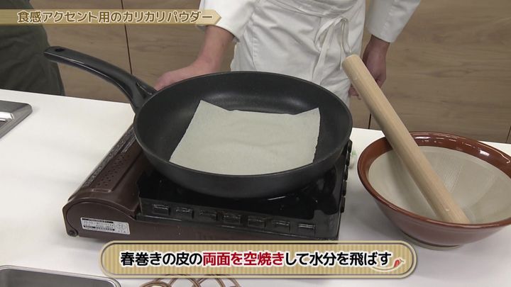 油をひいていないフライパンに春巻きの皮をのせて、火をつけます。表面を空焼きする感じで水分を飛ばします。