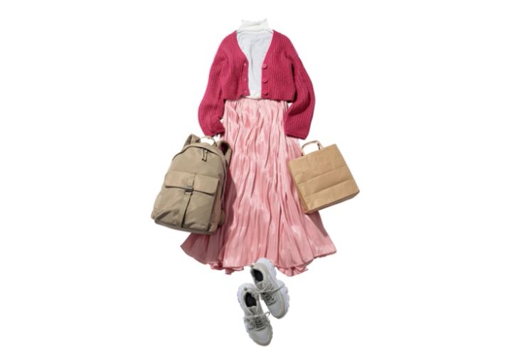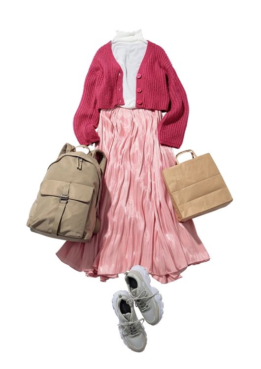 シアーカットソー¥1,590/神戸レタス、カーディガン¥12,650/JILL by JILLSTUART、サテンスカート¥17,600/リランドチュール、リュックサック¥6,590/ZARA(ザラ)、スニーカー¥8,800/ORTR( ダブルエー)