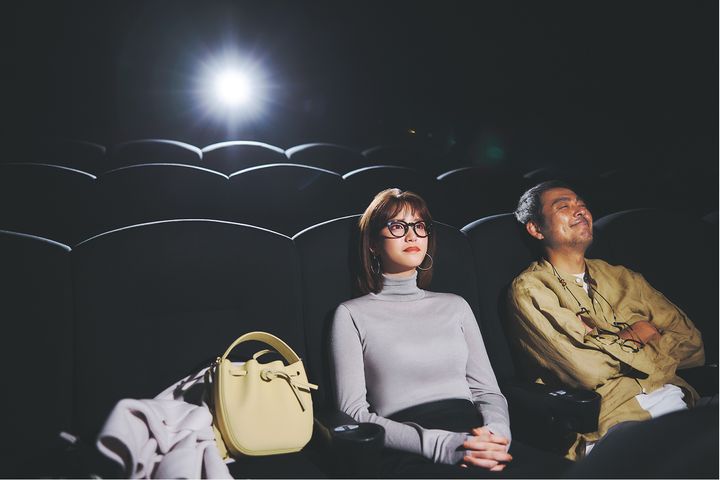 試写室で「ボーはおそれている」を改めて鑑賞する二人の頬に、ひとすじの涙が光る…。私、守りに入らなくてよかった。バッグ¥44,000(VASIC/ヴァジックジャパン)メガネ¥40,700(アイヴァン/アイヴァン 東京ギャラリー)イヤリング¥12,100(マージョリー・ベア/ココ シュニック新宿タカシマヤ店)[チーフ]シャツ¥44,000(ヘリル/にしのや)Tシャツ¥6,050(フルーツオブザルーム/ギャレット)メガネ¥48,400(アイヴァン/アイヴァン 東京ギャラリー)その他/スタイリスト私物