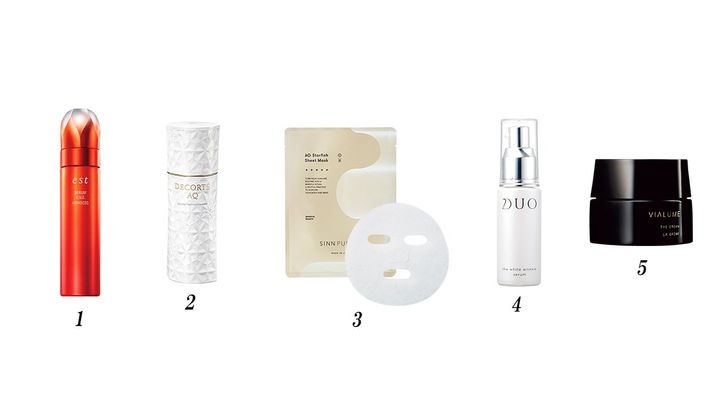 1を肌にのせたら内から外に向かってのばし、顔全体にしっかり浸透させる。小鼻や口角は指の腹で丁寧に押さえて。パック前に2を顔全体に塗って、肌を柔らかくする。3のパックを約15分のせてしっかり保湿する。4で肌に栄養を与えつつ毛穴をキュッと引き締める。最後に5のクリームを塗って水分にフタをしつつ、ふっくらとした肌に仕上げる。スキンケアの段階で丁寧にツヤを仕込んでおくことが、厚塗り感のないシンプルなベースメイクの手助けに!