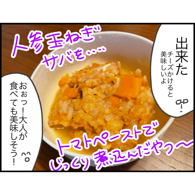 完成したのは、人参と玉ねぎとサバをトマトペーストでじっくり煮込んだ離乳食。