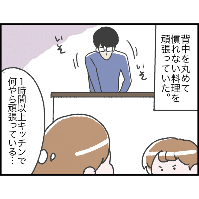 背中を丸めて慣れない料理を頑張るご主人を見守るしおさん。