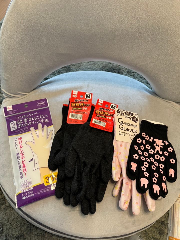 軍手は、防塵手袋が良いそうなのですが、園芸用の棘が刺さりにくいやつをダイソーで購入。釘やガラスで怪我しないように手袋を準備しておくと良いそう。