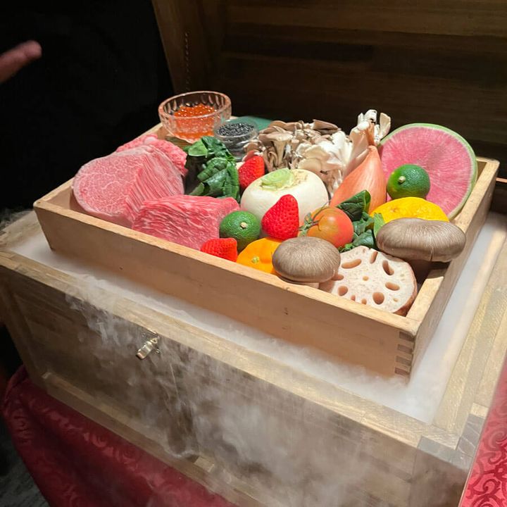 今回私がいただいたメニューは「Salon du kuma3 本日の晩餐」¥14,300(税込)。こちらはランチ、ディナー、どちらでも選べるメニューです。このように使う食材を見せてもらえました♡ 他にも、誕生日や記念日用のコース。しゃぶしゃぶやすき焼きのコースもあります。