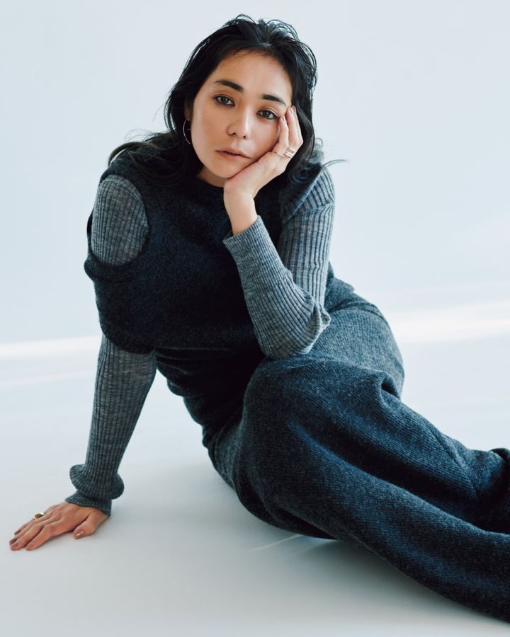 ニットタンク¥68,200、ニットスカート¥107,800(共にジア ストゥディオス/ザ・ウォール ショールーム)、リブニットトップス¥28,600(エブール/エブール GINZA SIX店)、ピアス¥140,800、右手小指リング¥59,400、左手小指リング¥68,200(全てヒロタカ/ヒロタカ 表参道ヒルズ)、左手薬指リング¥36,300(ヒロタカ/ビームス ハウス 丸の内)
