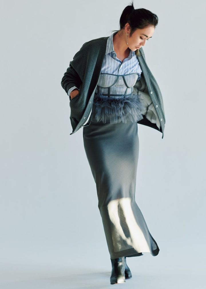 淡く繊細なグレーや青みを帯びたグレー、黒に限りなく近い深いグレーと、トーンの広さがグレーの面白いところ。濃淡を生かして奥行きのある着こなしを。ラフなスエットにパリッとした柄シャツ、滑らかなシルエットのスカートに透け感のあるチュール。オールグレーのコーディネートも、異なる素材を取り入れることで自然と濃淡がつき、立体感のある着こなしに。さらに異なるテイストをMIXすれば、グレーしか使用していないとは思えないほど変化に富んだスタイルが実現。