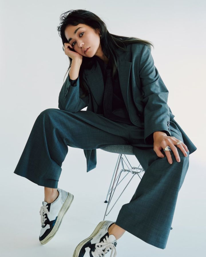 ジャケット¥41,800、パンツ¥23,100(共にジャーナル スタンダード レサージュ/ジャーナル スタンダード レサージュ 丸の内店)、ブラウス¥45,100(エブール/エブール GINZA SIX店)、スニーカー¥48,400(オートリー/トヨダトレーディング プレスルーム)、ピアス¥36,300(リエスタジオ/トゥモローランド)、左手人さし指リング¥88,000、左手薬指リング¥225,500(共にIVXLCDM/IVXLCDM 六本木ヒルズ)、右手薬指リング¥38,500(サンズ サンズ/RHC ロンハーマン)