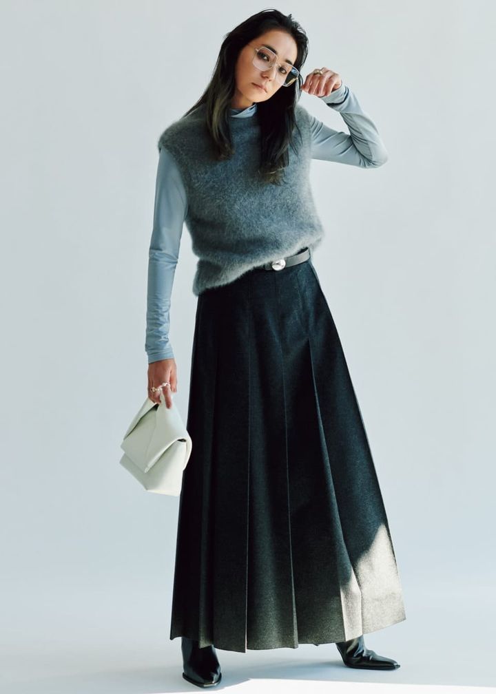 ニットベスト¥26,400(デ・プレ)、中に着たトップス¥15,400(テラ/ティースクエア プレスルーム)、スカート¥48,400(オーラリー)、ベルト¥24,200(ア ヴァケーション/プルミエ アロンディスモン)、メガネ¥38,500(グリッチ/ワンライズ)、左手中指リング¥60,500、右手人さし指リング¥37,400、右手中指リング¥97,900(全てエネイ/エネイ松屋銀座)、バッグ¥178,200(JW アンダーソン/JW ANDERSON 伊勢丹新宿メンズ店)、ブーツ¥16,500(ミラ オーウェン/ミラ オーウェン ルミネ新宿2店)
