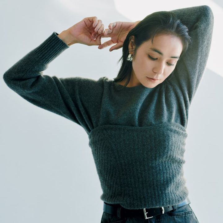 ニットトップス¥35,200、ビスチェ¥19,800(共にティッカ)、デニムパンツ¥25,300(スタイリング//styling/ルミネ新宿1店)、ピアス¥14,300(フィリップ オーディベール/トゥモローランド)、ベルト¥15,400(ロエフ/エイチ ビューティ&ユース)