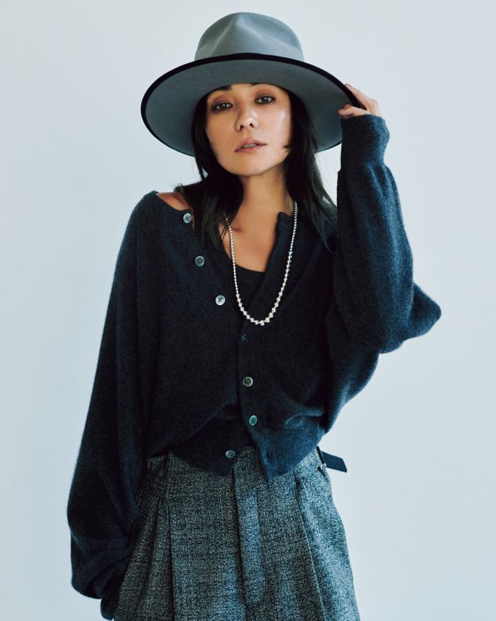 カーディガン¥49,500(アンスクリア/アマン)、中に着たニットタンク¥27,500(ピセア)、パンツ¥85,800(デパリエ/デパリエ ニュウマン新宿店)、ハット¥44,000(ステットソン/ステットソン ジャパン)、ネックレス¥62,700(リエスタジオ/トゥモローランド)