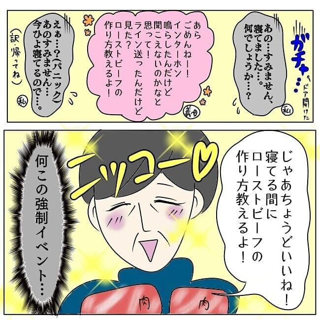 ・産後間もなくで心身ともにボロボロなのに、ローストビーフも手作りパンもアッブルパイも、作ってみる? じゃねぇーー! 今じゃなくていいだろ! ってものばかりで笑ってしまった。 お嫁さんに料理を教えたい! っていう謎の使命感ですかね。