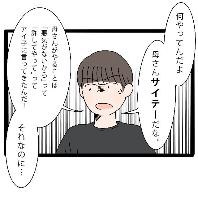 母さんがやることは『悪気がないから』って『ゆるしてやって』ってアイ子に言ってきたんだ!それなのに・・」