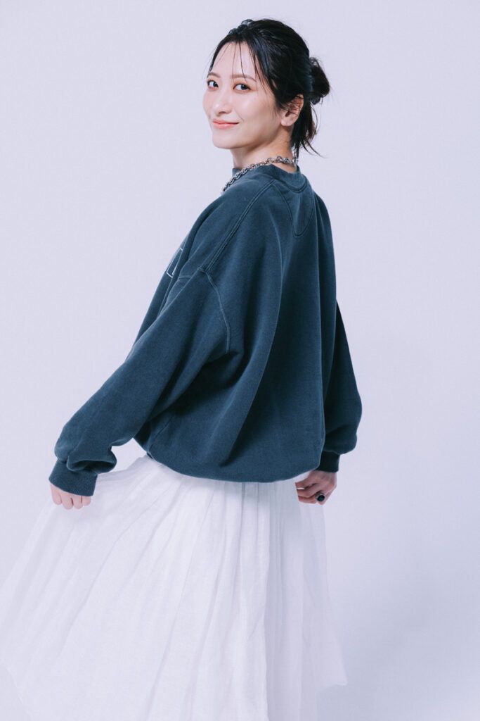 「スカートは軽やか&動きが出る素材のものを選びましょう! シワ加工があるものもおすすめです。オーバーサイズのスウェットも、軽快なイメージで着られますよ」