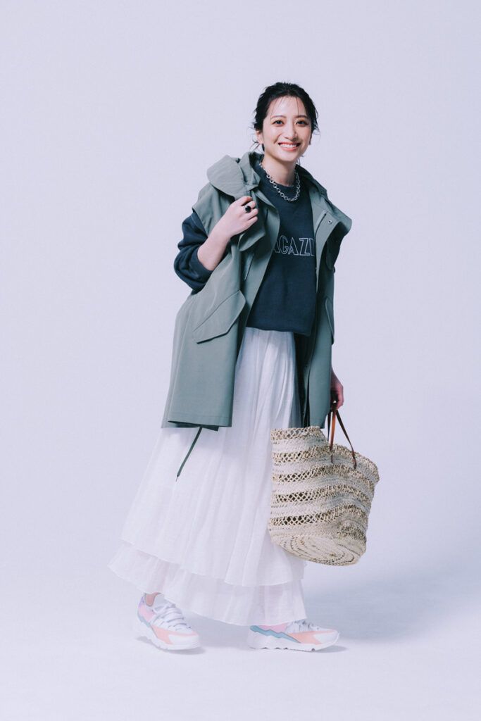 「カジュアルコーデを大人っぽくまとめたいなら、カジュアル感と女性らしさのバランスが重要。存在感のある白スカートの一点投入で、そのバランスが整います。スポーティブルゾンやスニーカーを足しても、ちゃんと女性らしさをキープ」(スタイリスト平沼さん)