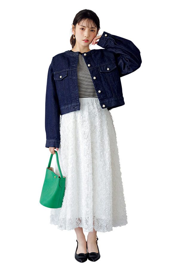 立体感のあるチュールスカートでデニムジャケットをフレッシュに。カジュアルに偏りがちなデニム&ボーダーには、リッチ感のある小物使いでシャレ感を加速させて。