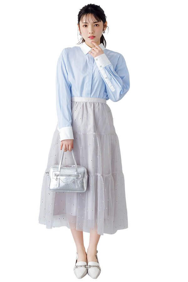 ストライプシャツを組み合わせることで、チュールスカートをお育ち良く見せる上級コーディネート。シルバーのメタリックバッグでちょっぴりエッジもきかせて。