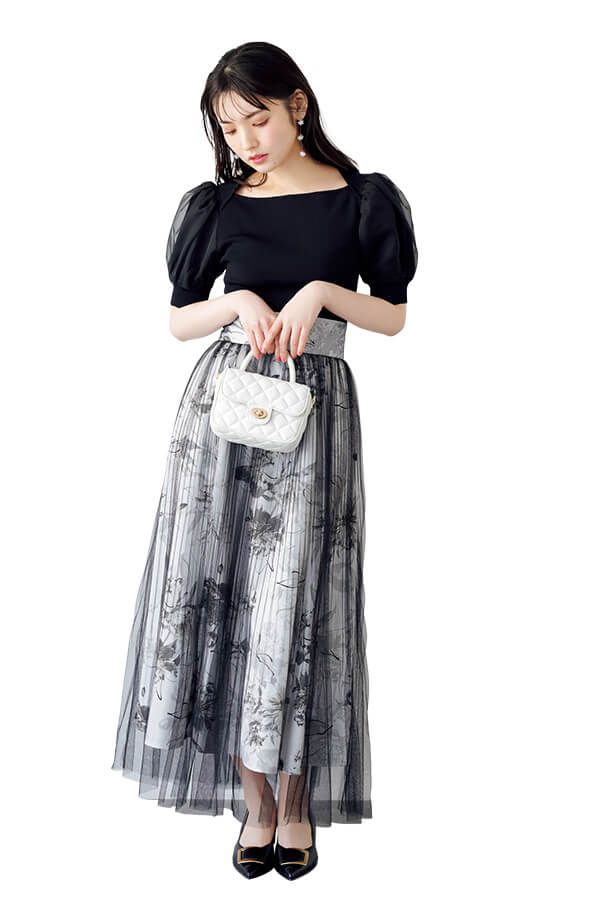 絵画チックな花柄にブラックチュールを重ねたエレガントなフレアスカート。チュールを味方につければ、春のブラックコーデも難なくクリアできます。