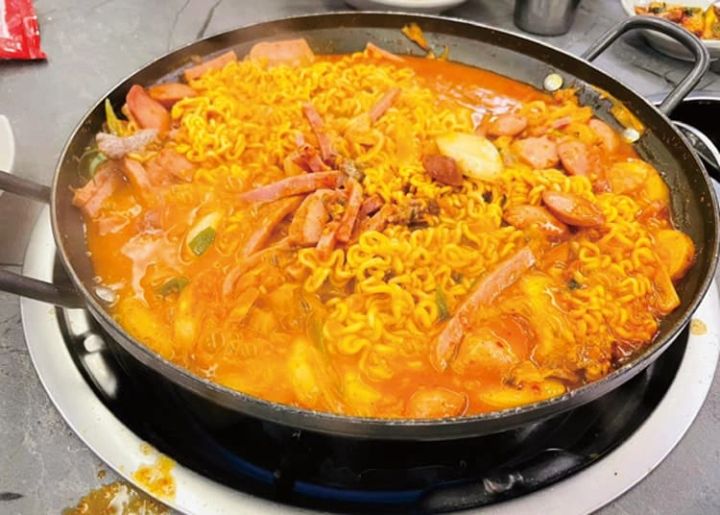 24時間営業が再開して、時間を気にせず食事ができるのが松炭のいいところ♡ スパムや餅、野菜が入ったほどよい辛さの特プデチゲ(約₩14,000)に乾麺を追加がオススメです♡